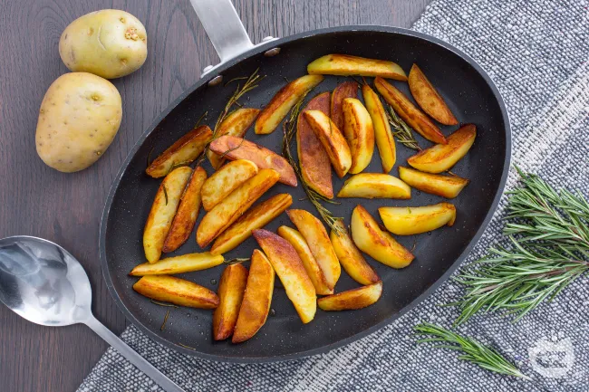 Il segreto risiede nella doppia cottura: l'acqua che ammorbidisce la polpa senza disfarla, poi l'olio extravergine che la trasforma in una superficie ambrata e fragrante. L'aglio sfrigola rilasciando note dolci e profonde, mentre il rosmarino fresco sprigiona le sue resine aromatiche, avvolgendo ogni spicchio in un abbraccio erbaceo che ricorda i sentieri assolati della campagna. Perfette per accompagnare un arrosto domenicale, queste patate portano in tavola un calore familiare senza rinunciare al carattere. Si prestano con uguale grazia a un pranzo informale o a una cena conviviale, dimostrando come la vera raffinatezza risieda spesso nella sapiente esecuzione dei piatti più semplici.