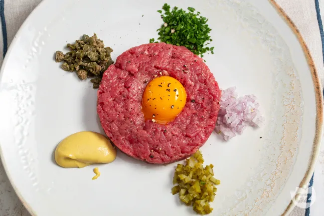 Al centro di questa sinfonia sensoriale, lo scamone si scioglie in bocca con una morbidezza vellutata, mentre lo scalogno e i capperi sotto sale introducono note vibranti che risvegliano il palato. Il tuorlo, cremoso e avvolgente, lega gli aromi in un abbraccio dorato, mentre i cetriolini sottaceto regalano scatti di freschezza croccante che rompono la ricchezza della carne.