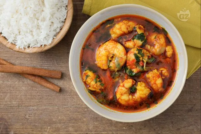 La magia risiede nel dialogo tra la curcuma, che dona ai crostacei una doratura vibrante e un'ombra terrosa, e la freschezza pungente dello zenzero e dello scalogno che taglia la ricchezza della salsa. Il peperoncino fresco non brucia, ma vibra in sottofondo, mentre la farina di riso lavora silenziosamente per regalare una cremosità setosa che avvolge ogni gambero come una carezza.