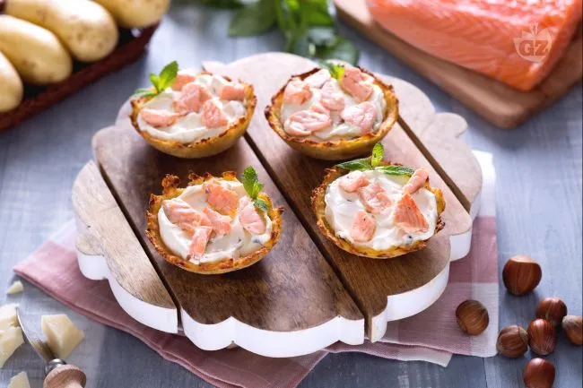 Deliziosi cestini croccanti di patate, farina di nocciole e Grana Padano, farciti con una spuma di formaggio fresco alla menta e cubetti di salmone scottato. Un antipasto monoporzione elegante e saporito, perfetto per una cena tra amici.