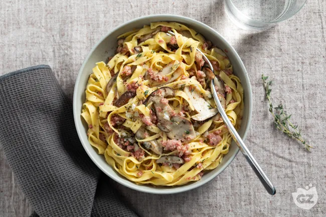 La magia risiede nel dialogo tra la luganega, sfumata fino a diventare caramellata e dolcemente pungente grazie al vino bianco, e l'umami intenso e vellutato dei porcini, che assorbono ogni aroma. Il tutto è magistralmente legato da un burro aromatizzato, dove lo scalogno appassito e il rosmarino rilasciano note balsamiche, creando una salsa setosa che avvolge ogni singola tagliatella all'uovo.