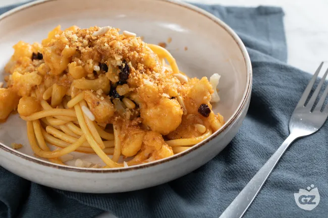 La magia sta nei contrasti che si fondono: la dolcezza caramellata dell'uva passolina dialoga con la sapidità profonda delle acciughe dissolte, mentre i pinoli tostati regalano una piacevole esplosione croccante. Lo zafferano, con la sua nota terrosa e il colore dorato, lega il tutto in un'emulsione setosa che avvolge la pasta senza appesantirla.
