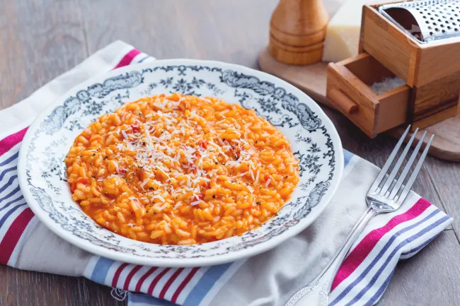 Il risotto all'amatriciana è un audace incontro tra la maestria nordica della mantecatura e l'anima rustica del Lazio, una promessa di sapidità profonda che conquista al primo cucchiaio. Questo piatto non è una semplice variante, ma una dichiarazione di carattere: il riso diventa il tessuto su cui si intrecciano il fuoco del pecorino e la dolcezza acida del pomodoro.