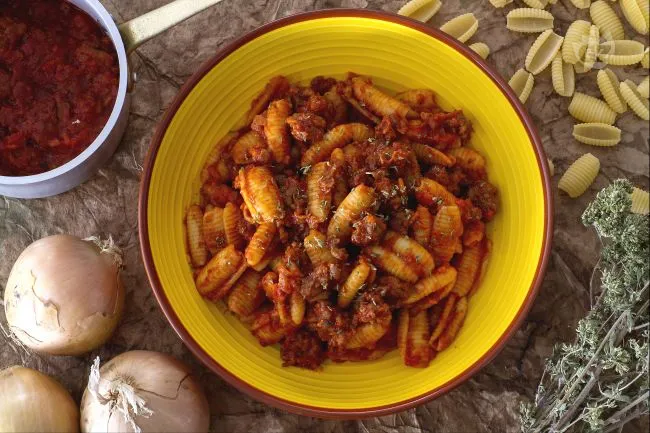 La salsiccia, speziata e succulenta, si scioglie nel vino rosso e nella passata, mentre le verdure tagliate finemente – carote, sedano, cipolle – fondano la loro dolcezza terrosa nel concentrato di pomodoro, bilanciato da una punta di zucchero che smorza l'acidità senza addolcire. Il risultato è una salsa vellutata che avvolge ogni gnocchetto, creando un contrasto tra la superficie ruvida della pasta e la cremosità del sugo.