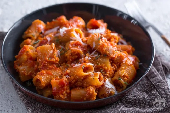 Un ragù che sfida le convenzioni, dove il cavolfiore si trasforma in una salsa vellutata e carnosa, capace di avvolgere la pasta con la stessa intensità di un classico ragù di carne. Questa versione vegetariana non è una semplice alternativa, ma una promessa di profondità di sapore, dove l'umami della passata di pomodoro dialoga con la dolcezza tostata delle verdure. La promessa è un primo piatto sostanzioso e sorprendentemente ricco.