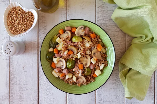Il farro perlato, con la sua consistenza nobile e leggermente gommosa, fa da tela a un mosaico di sapori decisi. I cavoletti di Bruxelles, saltati fino a un croccante dorato ai bordi, rilasciano la loro nota leggermente amara, mentre i funghi champignon, intensi e terrosi, offrono un contrasto umido e carnoso. Il provolone piccante e il prosciutto cotto a cubetti completano il quadro con punte di sapidità cremosa e salata.