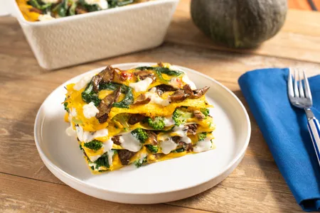 Ora tocca a te, come una nonna paziente! Prendi la pirofila. Stendi un foglio di lasagna, spalma crema di zucca, aggiungi funghi, verdure, pezzetti di crescenza e parmigiano. Ripeti gli strati finendo con pasta, crema, funghi e parmigiano. Fai con amore.