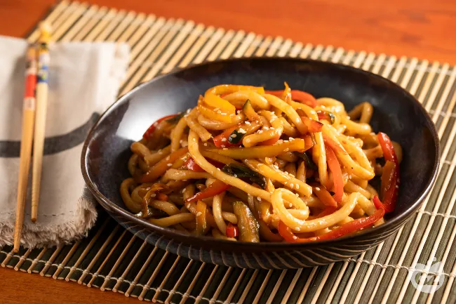 Immaginate la dolcezza caramellata dei peperoni gialli e rossi che incontra la freschezza terrosa delle zucchine, mentre le carote regalano una croccantezza sottile. Lo zenzero fresco e l'aglio, soffritti appena, rilasciano un profumo che anticipa la complessità del piatto, e il cipollotto aggiunge una nota finale leggermente pungente che lega ogni boccone. Perfetto per una serata informale con amici o una cena familiare che vuole stupire senza sforzi, questo udon si presenta come un quadro cromatico vivace: un piatto unico che sa essere sostanzioso e leggero al tempo stesso, lasciando una sensazione di soddisfazione piena ma mai pesante.