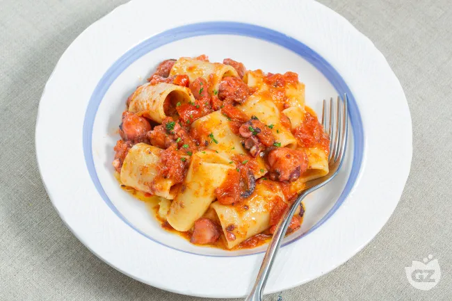 La magia nasce dal contrasto tra la tenerezza carnosa del polpo, che si sfalda al primo morso, e la vivace acidità dei pomodori Perini, stretti in un sugo che profuma d'aglio sfumato e del calore discreto del peperoncino. I paccherotti, con la loro forma accogliente, catturano ogni goccia di questo fonduto marino, mentre il prezzemolo fresco aggiunge un tocco di verde che risveglia il palato.