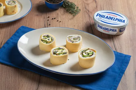 Stendi le crepe, spalma uniformemente il Philadelphia, adagia prosciutto e zucchine. Arrotola stretto, avvolgi nella pellicola e riponi in frigorifero per 2-3 ore.