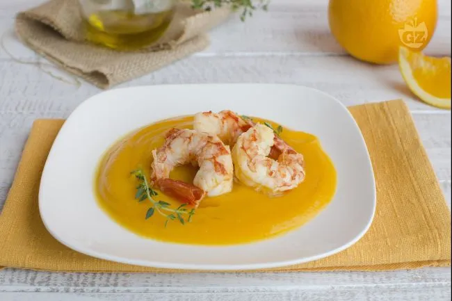 La magia risiede nei contrasti ben calibrati: la crema vellutata di zucca, arricchita da un filo d'olio extravergine e dalle punte terrose del timo, accoglie il succo d'arancia che porta una nota di freschezza brillante. Su questo fondale, i gamberi, semplicemente scottati, rilasciano tutta la loro dolcezza salmastra, creando un equilibrio perfetto tra ricchezza e leggerezza.