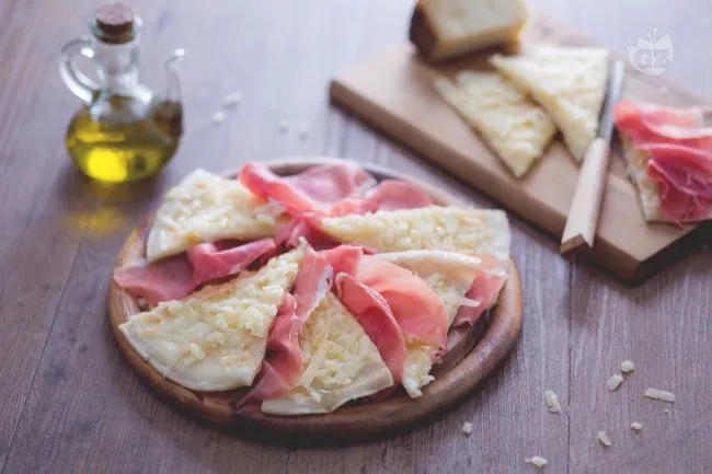 La magia si compone con ingredienti essenziali ma nobili: la farina 00 dona una struttura fine, mentre l'olio extravergine ne impregna l'anima con un sentore erbaceo. Il contrasto decisivo arriva dall'abbinamento: la friabilità salata del disco incontra la dolcezza grassa e intensa del prosciutto crudo di Norcia, mentre una nevicata di pecorino stagionato aggiunge un tocco piccante e granuloso che completa il quadro.