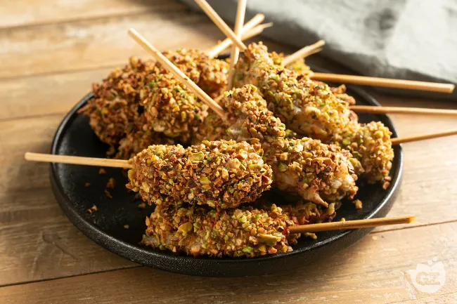 La magia sta nel contrasto: la pastella di birra, frizzante e leggera, crea una base ariosa che esalta la succulenza dei gamberoni, mentre la granella di pistacchi tostati aggiunge una nota rustica e un frantumio aromatico che si sposa con la dolcezza del crostaceo. L'olio extravergine, usato con parsimonia nella pastella, regala un retrogusto fruttato che completa il quadro. Perfetti per un aperitivo che vuole lasciare il segno o per inaugurare una cena importante, questi spiedini uniscono l'impatto visivo di un finger food dorato alla soddisfazione di una texture studiata in ogni strato.