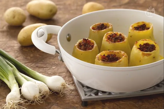 La magia risiede nei contrasti magistrali: la polpa farinosa delle patate si sposa con la succulenza del manzo e della salsiccia, mentre la pancetta affumicata dona una nota salina che esalta la freschezza agrumata della scorza di limone. I pomodorini ciliegino, sfrigolando, rilasciano una punta di acidità che taglia la ricchezza del ragù, creando un equilibrio perfetto tra rusticità e raffinatezza. Ideali per una domenica in famiglia o una cena conviviale, queste patate si presentano come piccoli scrigni dorati, capaci di trasformare il tavolo in un luogo di racconto e condivisione. L'effetto finale è quello di un piatto che nutre tanto il palato quanto l'anima, lasciando in bocca il ricordo persistente della tradizione ben eseguita.