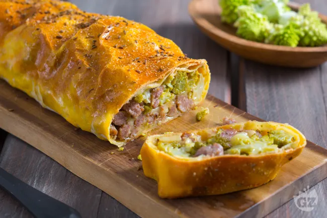 La salsiccia, speziata e succulenta, dialoga con il tocco aromatico del timo e la freschezza dei semi di finocchio, creando un equilibrio tra rusticità e finezza. Perfetto per una tavola conviviale, questo strudel conquista come piatto unico d'impatto, ideale per trasformare una cena tra amici o un pranzo familiare in un momento di autentico piacere, dove ogni fetta racconta la storia dei suoi ingredienti.