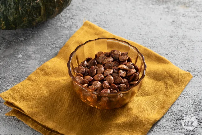 Sciacqua i semi di zucca q.b in una ciotola con acqua fresca, strofinali delicatamente per rimuovere i filamenti e la polpa residua.