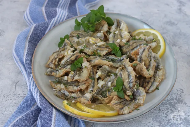un'esplosione di contrasti: la croccantezza dorata del fritto che cede il passo alla morbidezza succulenta, il piccante dell'aglio che danza con la freschezza erbacea della menta, l'acido dell'aceto che tempera la ricchezza dell'olio.