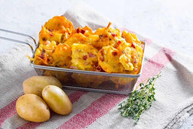 patate. Le frittelle di patate e speck sono piccoli scrigni dorati dove la semplicità contadina incontra l'eleganza di un aperitivo, promettendo un'esplosione di sapori decisi e confortanti. La magia sta nel contrasto: la patata grattugiata, che durante la cottura si trasforma in una rete croccante e dorata, abbraccia i cubetti di speck, il cui grasso si scioglie lentamente rilasciando note salate e affumicate.