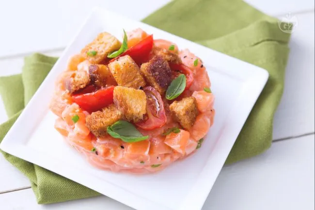 La chiave sta nella doppia tessitura: il salmone, tagliato a coltello per preservarne la succosità, viene avvolto da una marinatura acida e citrina che ne fissa il colore e ne esalta la dolcezza naturale. Contro questa morbidezza, la panzanella porta il suo carattere: la crosta del pane raffermo, ammorbidita solo in superficie dall'olio e dall'aceto, regala una piacevole resistenza, mentre i pomodorini scoppiano rilasciando un succo dolce-acidulo che lega l'insieme.