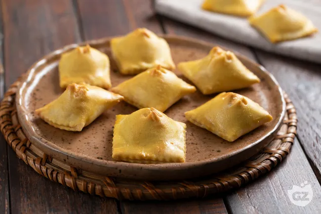 confortanti. Questi ravioli al forno custodiscono nel loro cuore dorato l'essenza di una tradizione familiare, trasformando pochi ingredienti nobili in un antipasto che sa di casa e di festa. La magia risiede nel dialogo perfetto tra la sfoglia sottile e croccante e il ripieno cremoso, dove il pecorino grattugiato sprigiona note salate e terrose che il Parmigiano Reggiano DOP addolcisce con la sua complessità nutty.