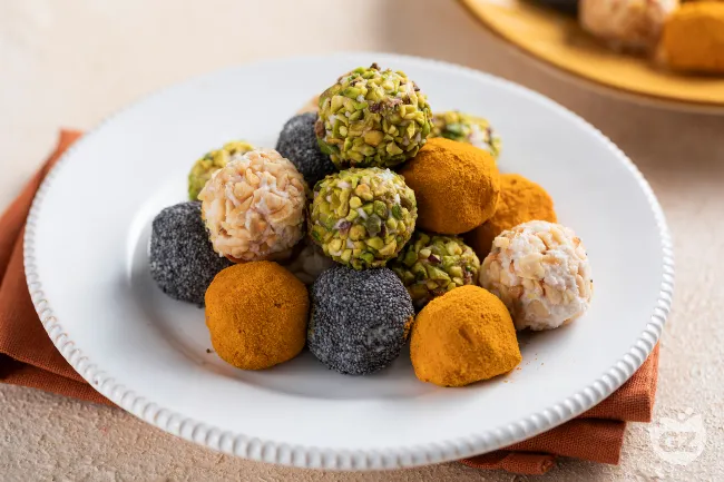 Il tutto è coronato da un manto variopinto e croccante, dove la terra calda della curcuma, il fruscio dei semi di papavero e la tostatura delle granelle creano un finale tattile e aromatico indimenticabile. Perfetti per un aperitivo ricercato o per animare un buffet festivo, questi tartufi uniscono una preparazione di sorprendente semplicità a un risultato di grande effetto, garantendo successo e conversazione.