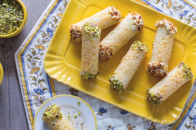 La magia risiede nei contrasti: la sfoglia di formaggio, dorata e friabile sotto i denti, racchiude una crema di ricotta setosa che scioglie in bocca note agrumate e terrose. La granella di pistacchi aggiunge una piacevole resistenza croccante, mentre l'erba cipollina fresca dona un tocco erbaceo che pulisce il palato.