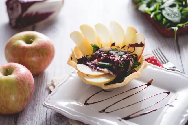 La magia risiede nei contrasti ben orchestrati: la calda aromaticità del formaggio stagionato, che in cottura sviluppa note di nocciola tostata, abbraccia la croccantezza succosa della mela Fuji e l'amaro gentile del radicchio, mentre gli spinacini novelli portano un tocco erbaceo e tenero. Il tutto è legato da un filo di aceto balsamico ridotto, una glassa intensa e vellutata che aggiunge profondità e un piacevole retrogusto dolce-acidulo.