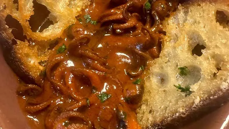 dove la tenerezza dei cefalopodi si fonde con la rotondità acida del pomodoro, creando un sugo che è già un racconto completo.