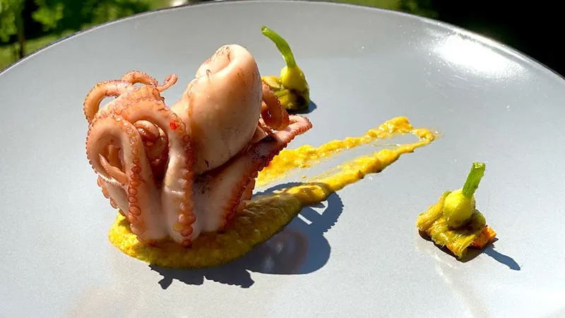 delicatezze marine e note floreali che danza sul palato: i moscardini con crema di fiori di zucca è un antipasto che seduce con la sua eleganza sottile e una promessa di sapori puliti, dove la tenerezza del mare incontra la vellutata dolcezza dell'orto.