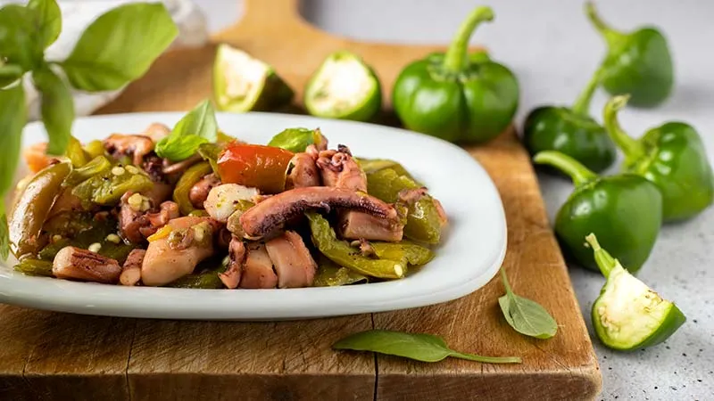 Il segreto risiede nel contrasto magistrale: la carne del polpo, soda ma morbidissima dopo una lenta brasatura, incontra la dolcezza carnosa dei peperoni rossi e la nota leggermente erbacea di quelli verdi, fondendosi in un fondo dove la cipolla rossa caramellata, l'aglio sfumato e il tocco opzionale di peperoncino creano un'onda di sapori rotondi e avvolgenti. L'alloro e il sedano donano quel sottile respiro aromatico che eleva il tutto senza sopraffare.