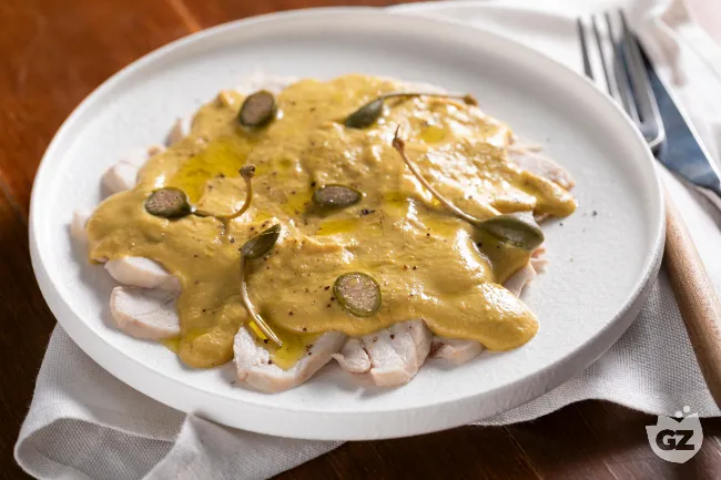 La magia sta nel contrasto: il petto di pollo, cotto al vapore in un brodo aromatico di cipolle bianche, sedano e carote con le note pepate dei grani di pepe nero e il tocco balsamico delle bacche di ginepro, diventa incredibilmente tenero e profumato. Su di esso, la salsa tonnata – una crema vellutata dove il tonno sott'olio si fonde con la maionese – deposita un'accarezzata sapida e umami che risveglia il palato senza coprire, ma anzi esaltando, la purezza della carne.