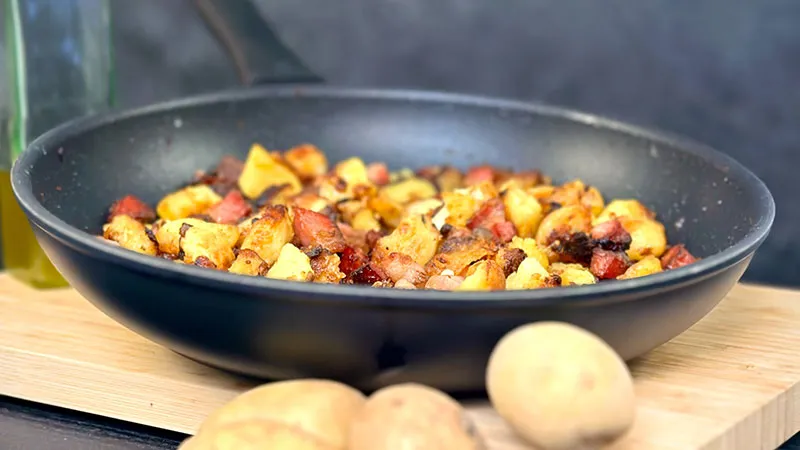 La magia avviene quando le fette di patata, dorate e croccanti ai bordi, assorbono il grasso aromatico della pancetta e la dolcezza caramellata della cipolla, creando un contrasto sublime tra la cremosità dell'interno e la croccantezza della superficie. L'olio extravergine e il burro, in un gioco di alleanze, fondono questi sapori in un insieme corposo e avvolgente.