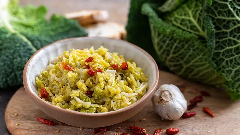 piatto trasforma un ortaggio umile in un'esperienza culinaria memorabile, dove la dolcezza terrosa della verza incontra il fuoco speziato del peperoncino in un abbraccio prolungato di cottura.