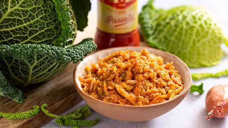 La magia risiede nel contrasto: lo scalogno, appassito nell'olio extravergine fino a diventare una base fragrante e dolce, apre la strada alla verza che, cedendo alla lenta stufatura, perde ogni traccia di austerità per rivelare note quasi caramellate. La passata di pomodoro, aggiunta al momento giusto, lega il tutto con la sua vellutata acidità, creando un sugo ricco che avvolge ogni foglia senza sopraffarla.