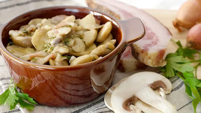 Il contrasto è l'anima della ricetta: la morbidezza carnosa dei champignon, resi vellutati dalla cottura lenta, incontra il guanciale croccante che rilascia il suo grasso dorato e profumato. Lo scalogno sfuma la potenza con una nota dolce e appena pungente, mentre il prezzemolo tritato a crudo esplode in freschezza erbacea, bilanciando il tutto con un tocco di vivacità.