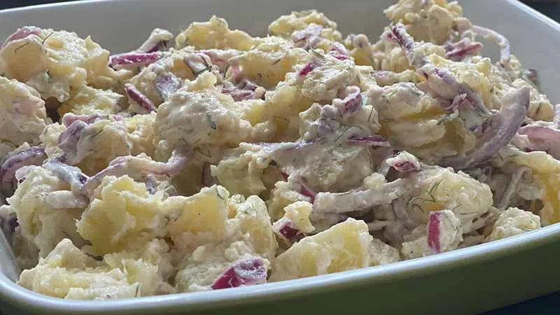 La magia risiede nei contrasti sapientemente orchestrati: la tenerezza burrosa delle patate appena cotte cede il passo al morso fresco e leggermente piccante delle cipolle rosse, marinate in un tocco di aceto di mele. Su questo duetto si stende una salsa vellutata, dove lo yogurt greco dona una nota acida e fresca, addolcita dal miele e riscaldata dal soffice abbraccio della paprica dolce, mentre l'aneto sparge la sua freschezza erbacea.