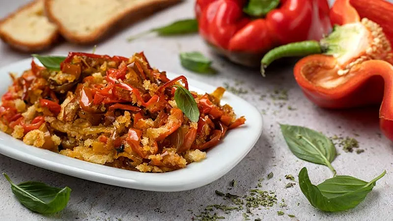 La magia nasce dall'incontro tra la polpa carnosa e dolce dei peperoni, appassita nell'olio fino a diventare seta, e la croccantezza dorata della mollica tostata, che trattiene il profumo dell'aglio e dell'origano. A completare, il guizzo sapido dei capperi, la punta di dolcezza dell'uva passa e la grattugia finale di pecorino che fonde ogni nota in un abbraccio caldo e avvolgente.