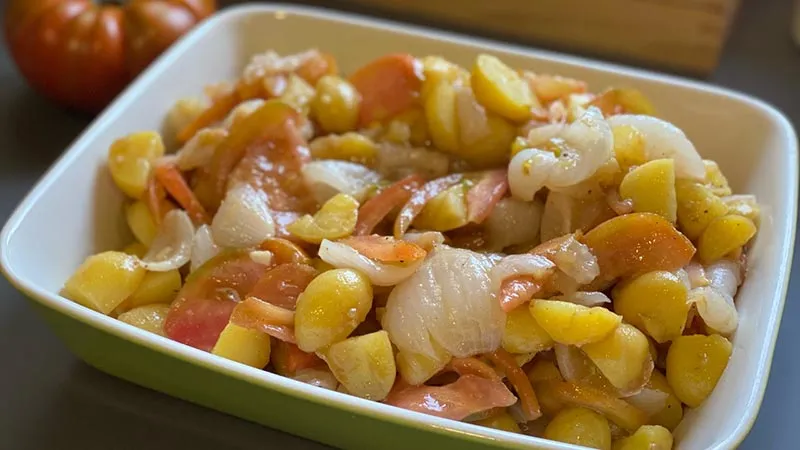 La magia risiede nei contrasti: le patate novelle, tenere ma consistenti, si sfaldano appena sotto i denti, mentre la cipolla bianca, affettata finemente e lasciata ad ammorbidirsi, offre una dolcezza penetrante che placa l'aggressività dell'aceto balsamico. I pomodori costoluti, con la loro polpa soda e succosa, esplodono in un tocco finale di freschezza, legando il tutto in un abbraccio dall'olio extravergine fruttato.