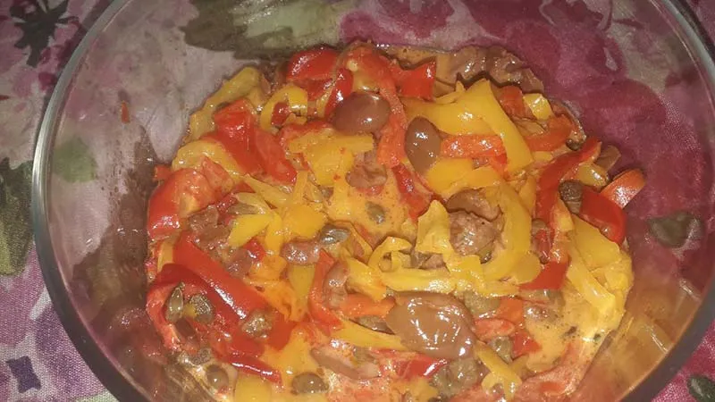 Ogni boccone rivela un contrasto magistrale tra la morbida consistenza dei peperoni e il morso deciso delle olive denocciolate, con l'olio che lega gli elementi in un abbraccio lucido e aromatico. Perfetto per trasformare una cena informale in un momento di genuina convivialità, questo contorno dal carattere marcato porta in tavola, con disarmante semplicità, tutta l'autenticità e il calore della cucina del sud.