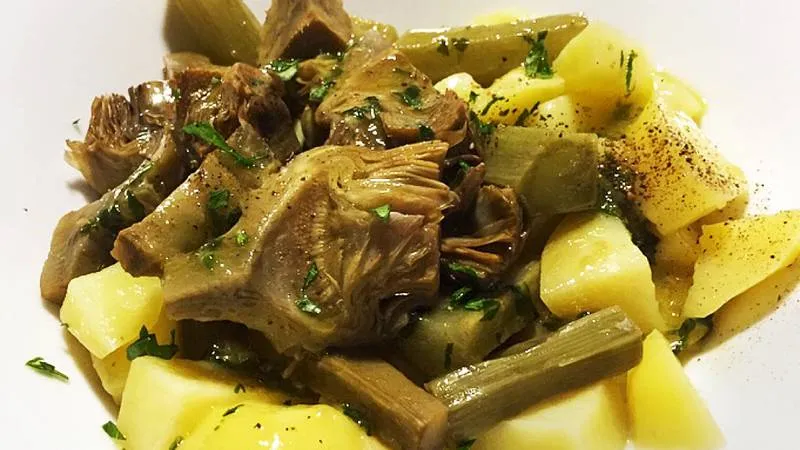 L'aglio, appena sfumato nell'olio, e il prezzemolo tritato al momento creano un 'verde' che è più di un colore: è un'esplosione sensoriale. Il fondo aromatico avvolge le verdure senza sopraffarle, regalando un contrasto tra la dolcezza carnosa delle patate e la leggera punta amarognola dei carciofi, mentre l'olio extravergine lega il tutto con un filo d'oro fruttato.