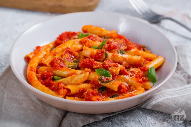 Il carattere della ricetta nasce dall'incontro tra Ziti, Lardo Di Colonnata, Pecorino Romano Dop, Pomodori Pelati San Marzano: consistenze diverse, profumi netti e sapori che restano equilibrati al palato.