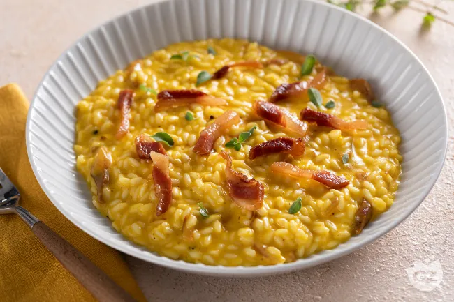 La magia si compone nel contrasto tra la dolcezza burrosa dei tuorli, che legano il riso in una salsa setosa, e il guanciale croccante, che rilascia note salate e aromatiche ad ogni boccone. Il Pecorino Romano DOP aggiunge una punta sapida e granulosa, mentre il vino bianco sfuma l'insieme con una leggera acidità, bilanciata dal fondo caldo del brodo vegetale.