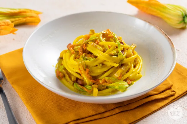 Un'armonia di sapori che canta l'Abruzzo in un piatto: i bucatini incontrano la primavera dorata dello zafferano e la delicatezza effimera dei fiori di zucca, in un abbraccio cremoso spezzato solo dal guanciale croccante. È un primo piatto dal carattere deciso ma elegante, che promette un viaggio sensoriale tra la rusticità della tradizione e un tocco di raffinatezza contemporanea.