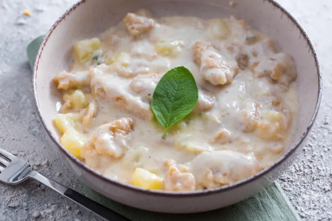 La magia avviene quando il burro dorato all'aglio e salvia incontra il Casera Valtellina, che si fonde in una salsa setosa e leggermente piccante, grazie alla Pesteda. I morbidi gnocchetti di pangrattato, cotti insieme a patate dolci e farinose, catturano questo condimento, creando un contrasto delizioso tra la crosticina esterna e il cuore tenero, tra la rusticità della pasta e la raffinatezza della crema di formaggio.