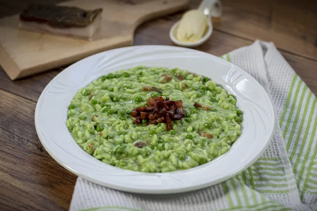 La magia nasce dall'incontro tra la croccantezza salata della pancetta tesa, che si scioglie in piccoli cristalli di sapore, e la dolcezza vellutata dei piselli ridotti in crema. La cipolla rossa di Tropea, stufata con pazienza, dona una nota caramellata che lega ogni elemento, mentre il brodo vegetale infonde al Carnaroli una consistenza setosa che avvolge il palato.