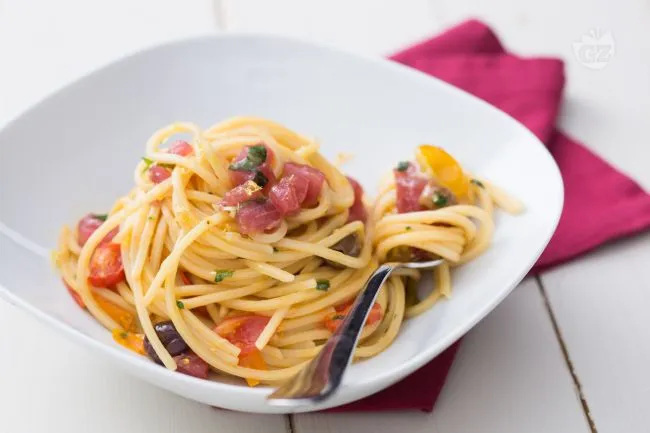 Il segreto risiede nel dialogo tra il tonno, marinato con la scorza di limone che ne esalta la delicatezza senza coprirla, e l'esplosione zuccherina dei pomodorini multicolore, leggermente caramellati. Le olive taggiasche aggiungono una nota salmastra e minerale, mentre il peperoncino fresco introduce un calore sottile che si diffonde in fondo al palato, legato dall'oro fruttato dell'olio extravergine.