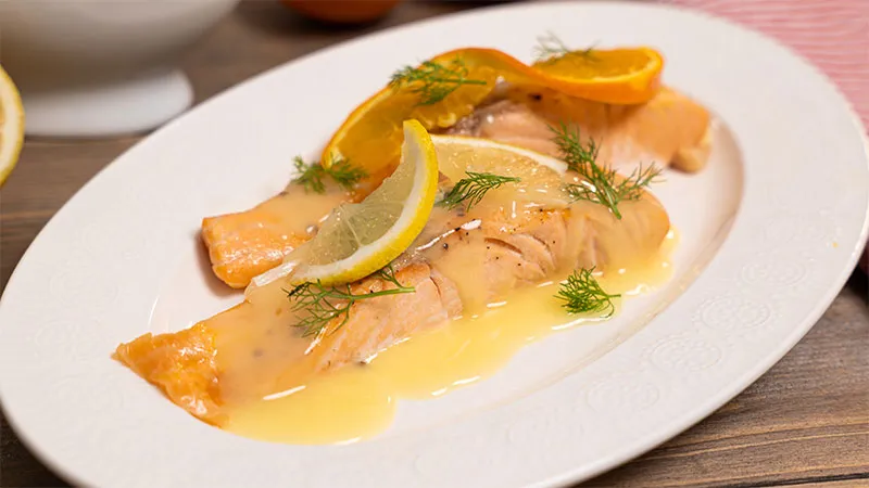 La magia avviene nell'incontro tra la ricchezza burrosa del salmone e l'acido brillante degli agrumi, dove il succo d'arancia dona note solari e lo zucchero di canna le arrotonda con calore ambrato. Al vapore, ogni filetto si trasforma in una tenera carezza che trattiene i profumi, mentre l'amido di mais addensa la salsa in una crema setosa che avvolge senza appesantire.