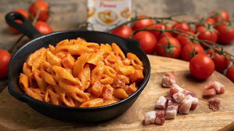 La magia avviene quando la pancetta dolce, rosolata fino a diventare croccante, rilascia i suoi grassi aromatici fondendosi con la dolcezza della cipolla rossa stufata. La polpa di pomodoro aggiunge una nota acida e fruttata che taglia la ricchezza, mentre la panna da cucina lega il tutto in una cremosità setosa che aderisce perfettamente alle scanalature delle pennette.