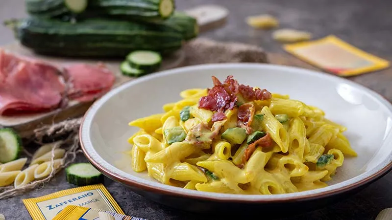 La magia nasce dal contrasto tra la dolcezza fondente delle zucchine, stufate fino a diventare quasi una crema, e il guizzo salino e affumicato della pancetta croccante. I ciliegini, scoppiettanti di freschezza, offrono una nota acida che taglia la ricchezza, mentre lo zafferano dipinge il tutto con il suo colore prezioso e il suo aroma terroso e inconfondibile.