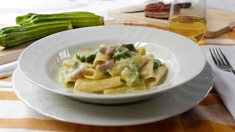 La pancetta affumicata, rosolata fino a raggiungere una croccantezza dorata, dialoga con le zucchine tenere che conservano un lieve morso, mentre la panna da cucina - usata con parsimonia - non copre ma esalta i sapori, creando una cremosità setosa che aderisce perfettamente ai solchi dei rigatoni. L'olio extravergine aggiunto a crudo dona un finale erbaceo e pepato che risveglia l'insieme. Perfetto per una cena informale ma curata, questo primo unisce la praticità di una preparazione rapida all'eleganza di un piatto ben bilanciato, capace di conquistare sia gli adulti con i suoi contrasti sofisticati sia i più piccoli con la sua texture avvolgente.
